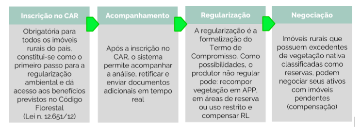 É o registro público eletrônico de âmbito nacional, obrigatório para todos os imóveis rurais, com a finalidade de integrar as informações ambientais das propriedades e posses rurais referentes às Áreas de Preservação Permanente - APP, de uso restrito, de Reserva Legal, de remanescentes de florestas e demais formas de vegetação nativa, e das áreas consolidadas, compondo base de dados para controle, monitoramento, planejamento ambiental e econômico e combate ao desmatamento. A inscrição no CAR é o primeiro passo para obtenção da regularidade ambiental do imóvel.