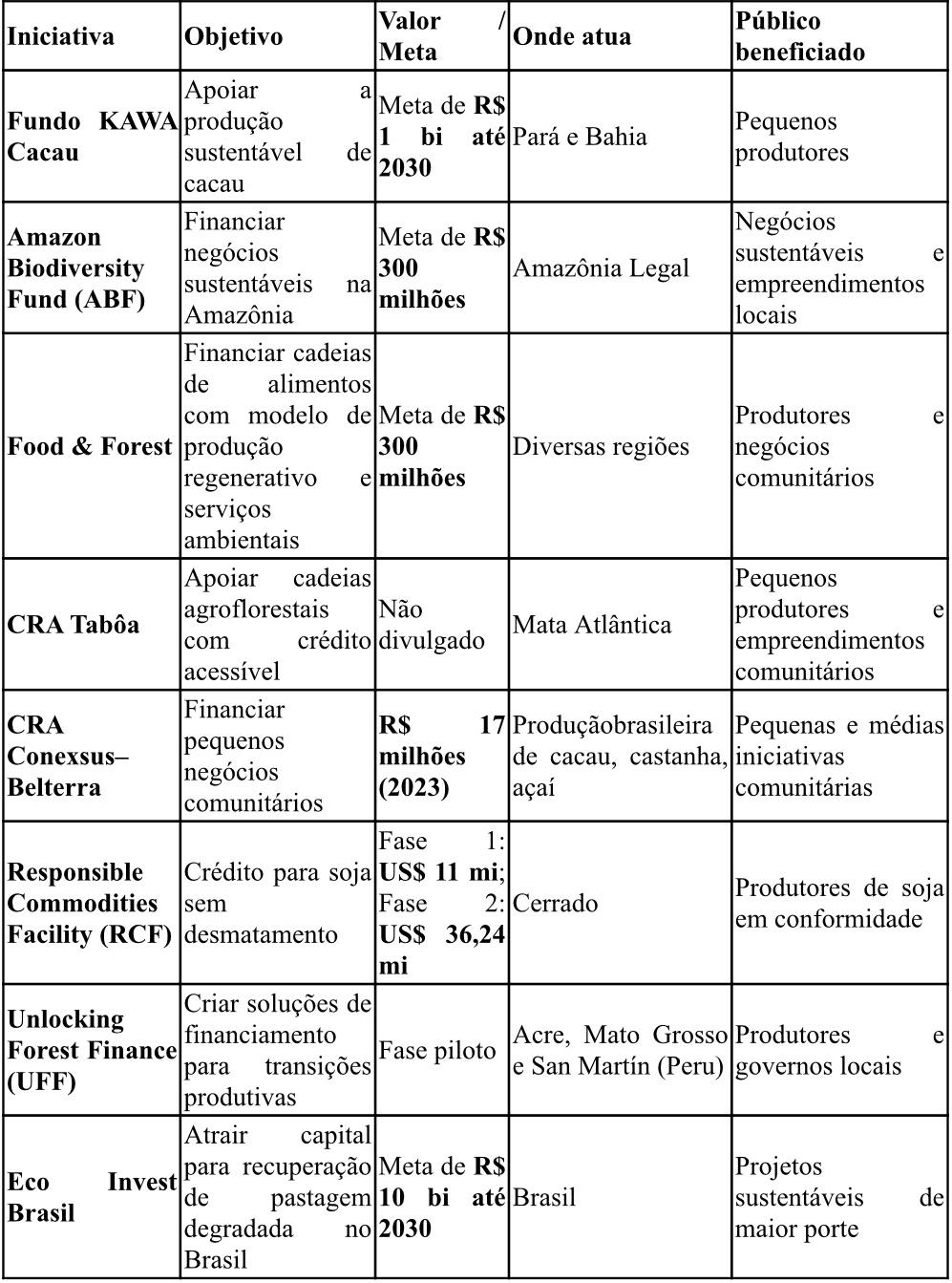 Esses mecanismos funcionam, na prática, como gatilhos para destravar iniciativas que dificilmente avançariam apenas com crédito tradicional. Experiências recentes no país ilustram esse movimento: diferentes estruturas de blended finance permitiram transformar oportunidades ambientais em projetos investíveis, especialmente em cadeias agroflorestais, sistemas regenerativos e modelos produtivos de baixa emissão. O Quadro 1 sintetiza algumas dessas iniciativas, mostrando como garantias, assistência técnica, capital concessional e instrumentos de mitigação de risco têm sido utilizados em diferentes regiões e perfis produtivos.